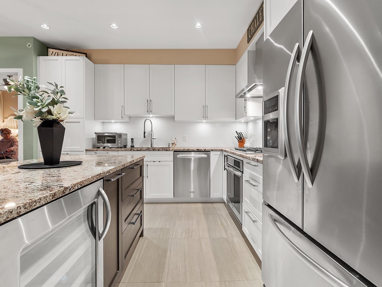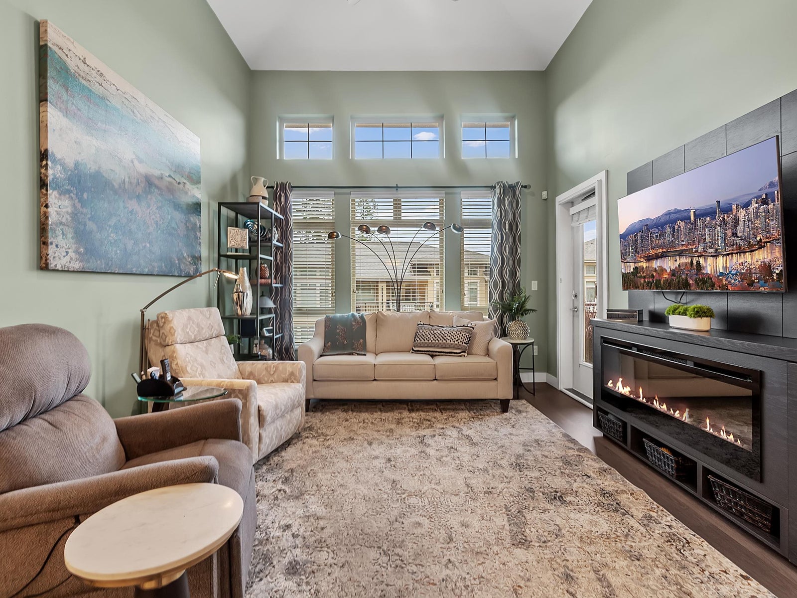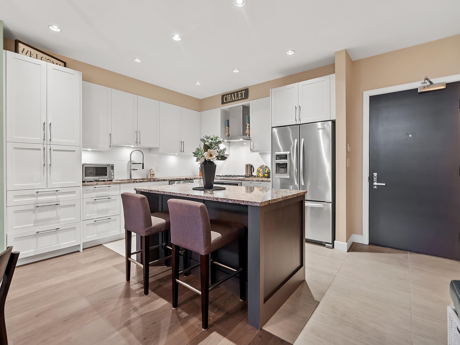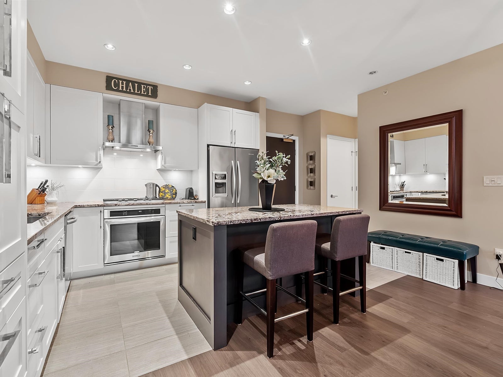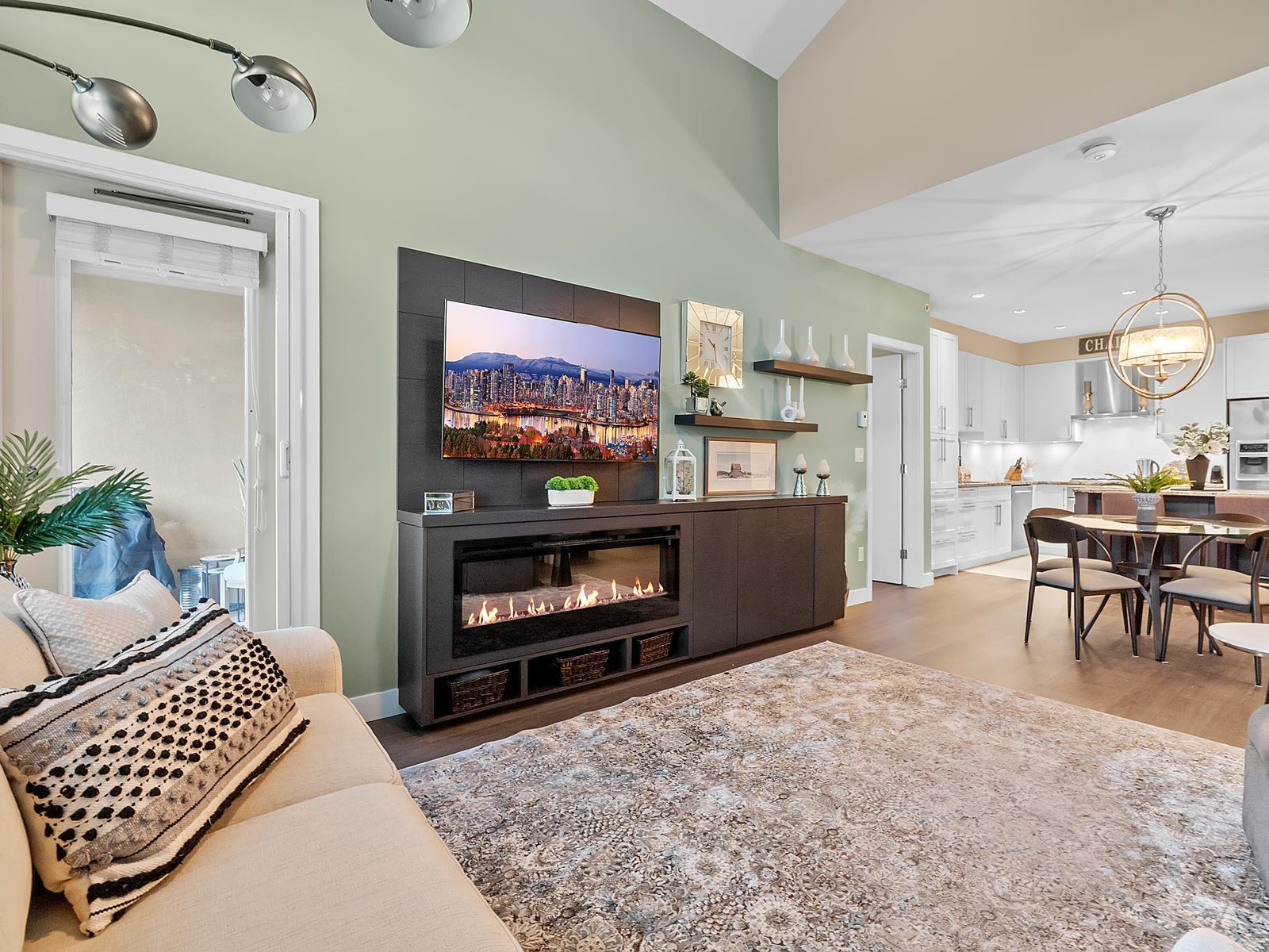 ADAGIO 1! Top-floor 2-bedroom + den residence offers refined living with open-concept layout and high-end finishes throughout. Custom features including a built-in desk, and fireplace with entertainment centre and shelving keeps the home uniform and clutter free. Enjoy lofty overheight ceilings in the living area, 9' ceilings throughout, and access to a spacious covered balcony overlooking the tranquil courtyard. The gourmet kitchen complete with stainless steel appliances, wine fridge, granite countertops, and sleek cabinetry. Exceptional amenities include a fitness centre, steam room, and a stylish clubhouse with fireplace and pool table. Ideally located steps to parks, shopping, and transit, this move-in-ready home delivers effortless luxury and lifestyle.