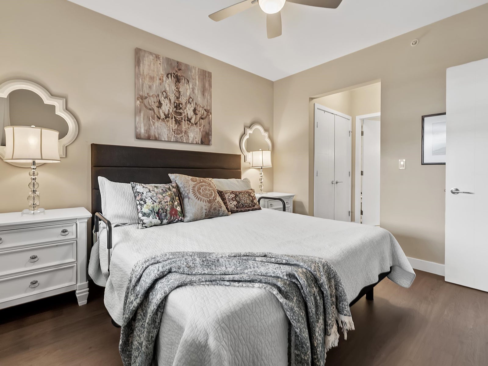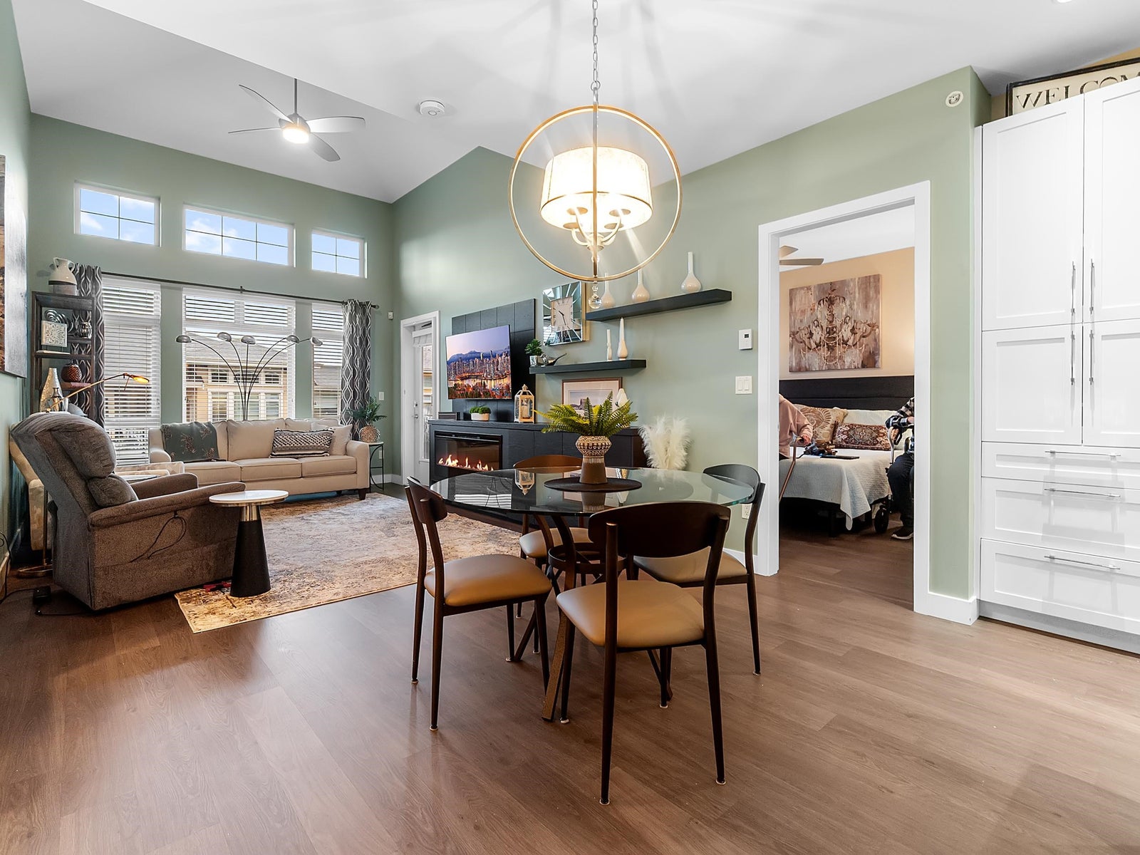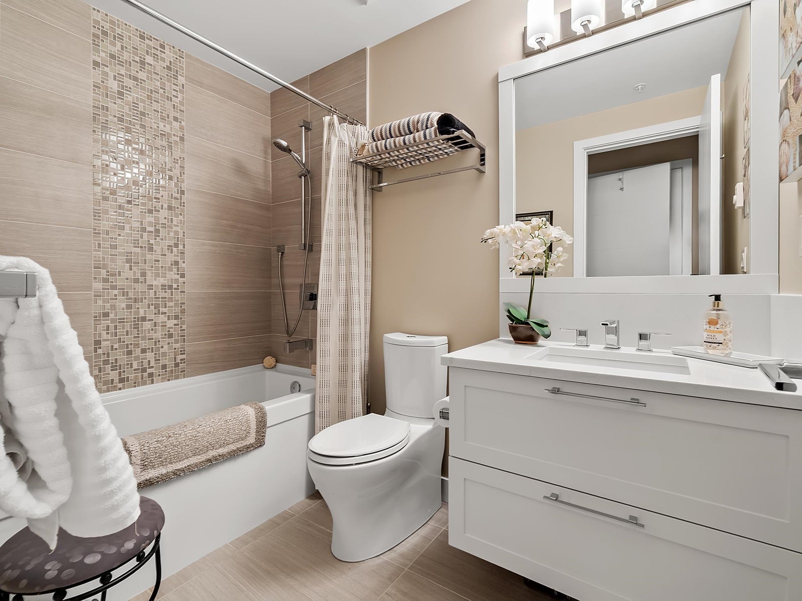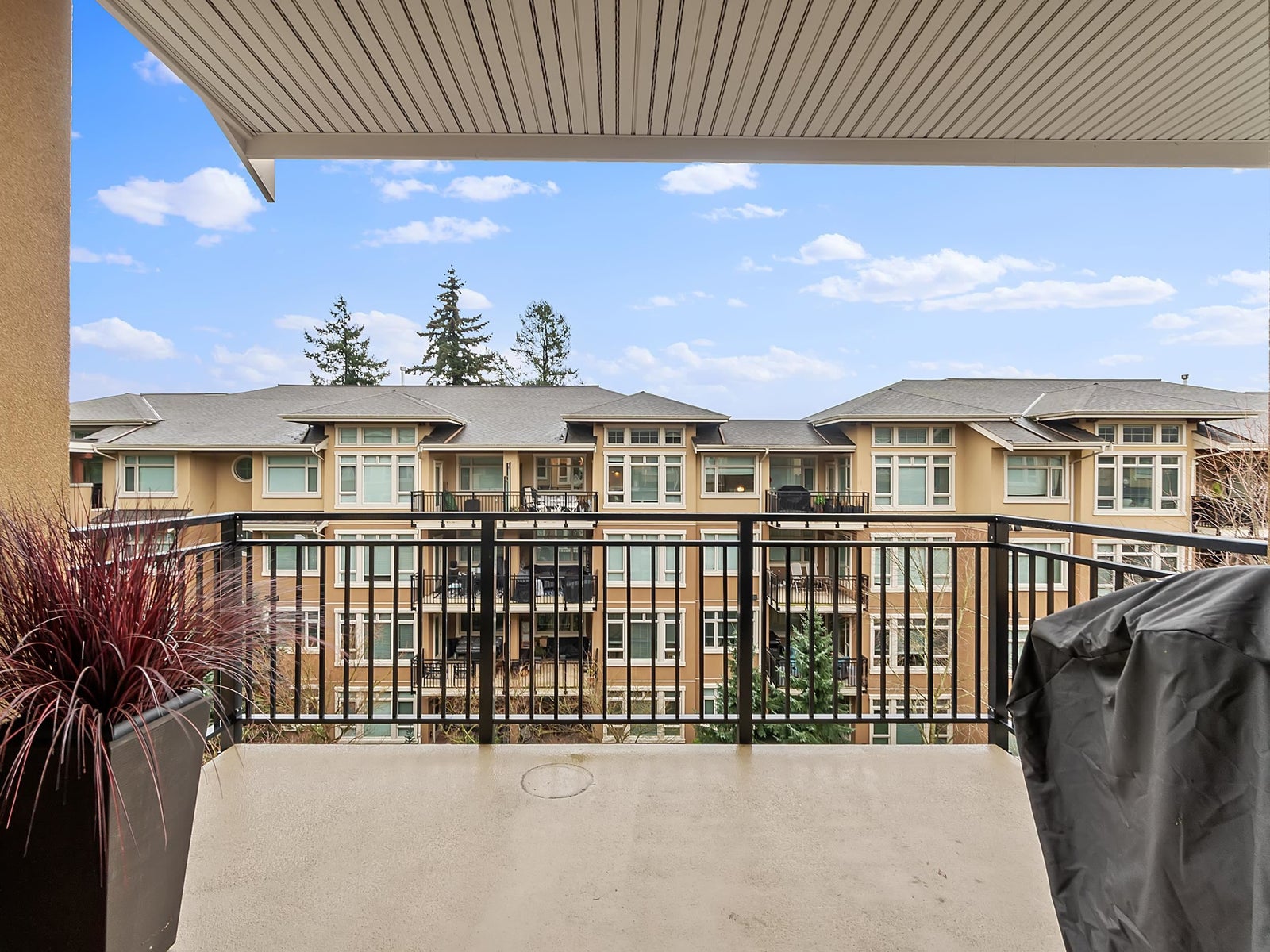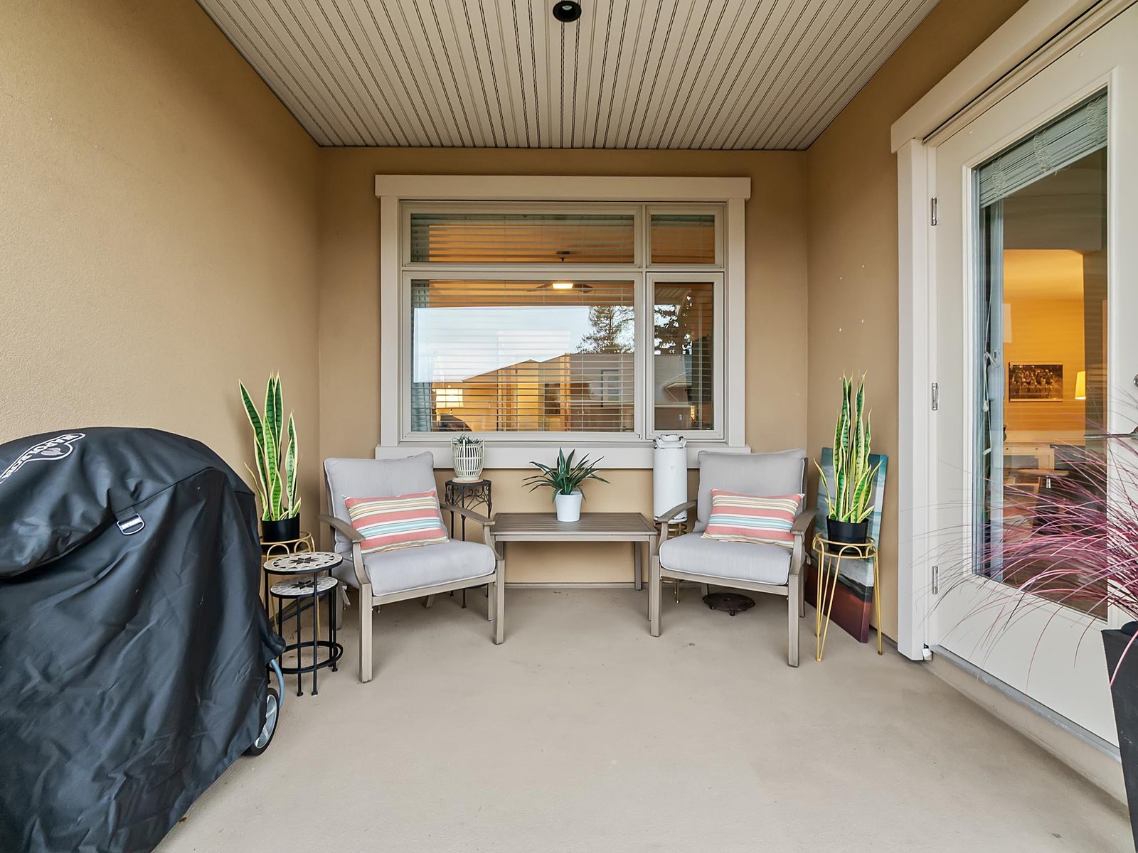 ADAGIO 1! Top-floor 2-bedroom + den residence offers refined living with open-concept layout and high-end finishes throughout. Custom features including a built-in desk, and fireplace with entertainment centre and shelving keeps the home uniform and clutter free. Enjoy lofty overheight ceilings in the living area, 9' ceilings throughout, and access to a spacious covered balcony overlooking the tranquil courtyard. The gourmet kitchen complete with stainless steel appliances, wine fridge, granite countertops, and sleek cabinetry. Exceptional amenities include a fitness centre, steam room, and a stylish clubhouse with fireplace and pool table. Ideally located steps to parks, shopping, and transit, this move-in-ready home delivers effortless luxury and lifestyle.